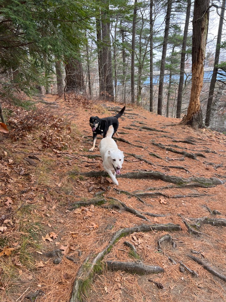 Meet Poppy of the pines! Although born and breed in Wyoming, Poppy is a true Maine dog. A lover of the rocky coast, pine tree covered forest, and of course snow! Poppy’s favorite activity is a romp around Popham, her namesake beach. She loves splashing through water, rolling around in seaweed and chasing squirrels through the forest. Poppy is a great trail dog and currently working towards her Novice Pack Certification. She responds well to our calls but uses her nose to navigate the trail and stays close to us with very little direction. She is very focused, motivated, and agile on the trail. This is where she thrives. Poppy prefers the quiet of the woods over a trip to the farmers market. It takes strangers a bit of time and lots of treats to gain her trust and loyalty before being a part of what we refer to as Poppy’s “inner circle.” But wow, once you are in, she is extremely affectionate and a total sweetheart. Our friends and neighbors are so proud when they get a kiss from Poppy! Poppy is a dog’s dog, a social butterfly at our local dog park and gains a huge amount of confidence around humans when she is in the presence of other dogs. She lures everyone in with her gorgeous buff coat and apricot ears but she’s not afraid of getting down and dirty in the mud with her pals. She gets along well with dogs of all sizes and personalities, does well with her cat brother, and adores our 7 year old daughter. She is extremely loyal to her humans. We are greeted every morning and when we return to the house with not just a tail wag but a full butt wiggle, lots of kisses, and the Chinook “roo”. She is independent and loves having her own space but lets us know when it’s time for her cuddle and belly scratch. She is a very clear communicator. Poppy has an excellent off switch. She can often be found in our window seat overlooking the Kennebec River, sunning herself while she tracks the birds and watches the neighbors stroll by. Always ready to rush to the door if a pal walks by!