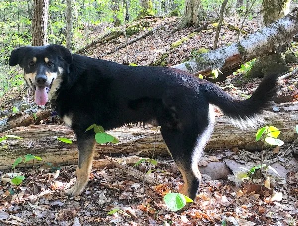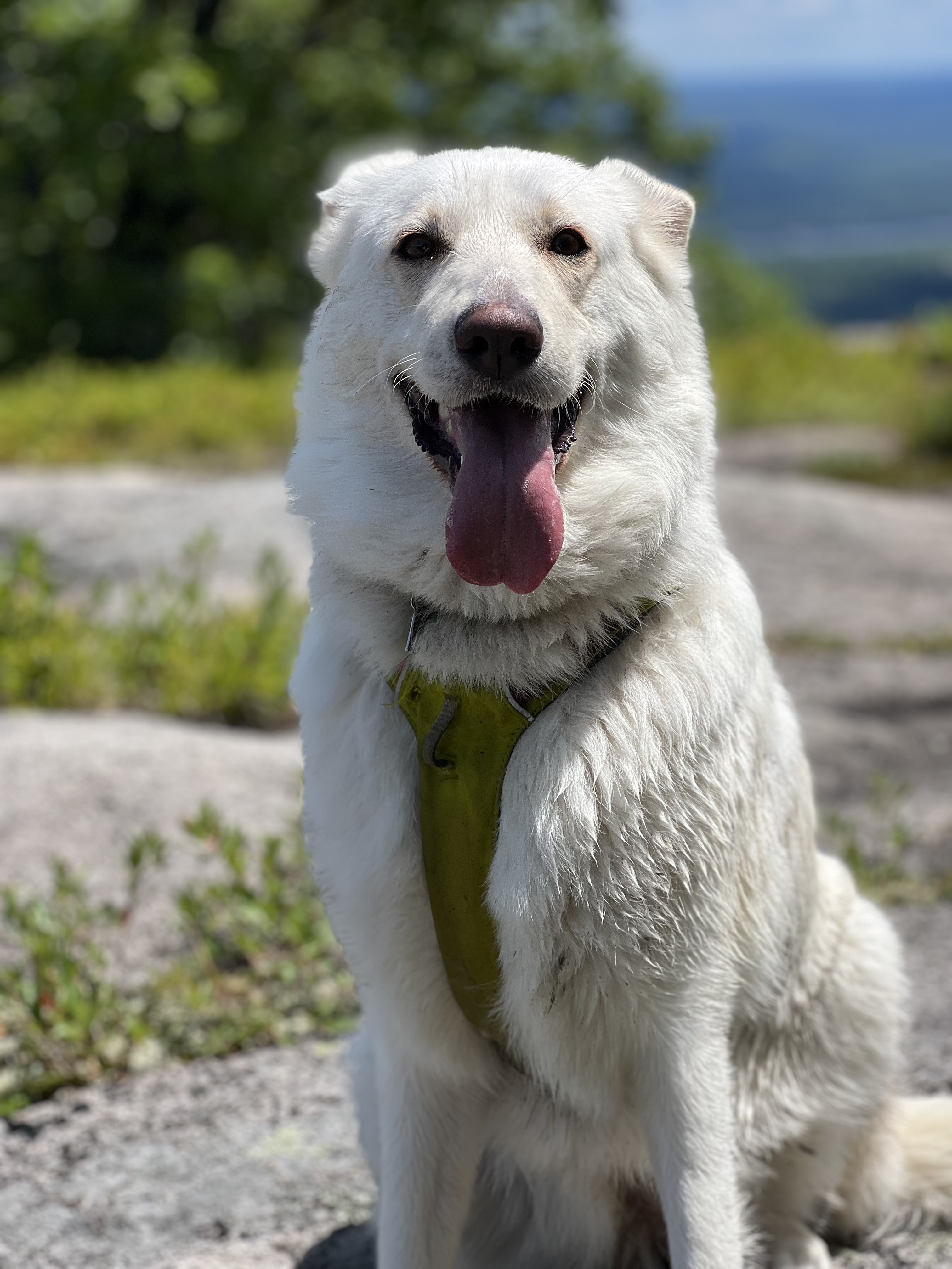 Like many of my breed, I am very smart, very sweet, and very mischievous and spontaneously burst into song. I love all dogs, all people, and all activities except visits to the vet (but I still give the doctor kisses). I am an accomplished hiker and have great trail and land sense. I adore swimming and never skip a swimming hole on my daily walks. My best friends are my older sister Bella (another Chinook) and a funny fuzzy cat who pretends to be scared of me but then sleeps next to me.